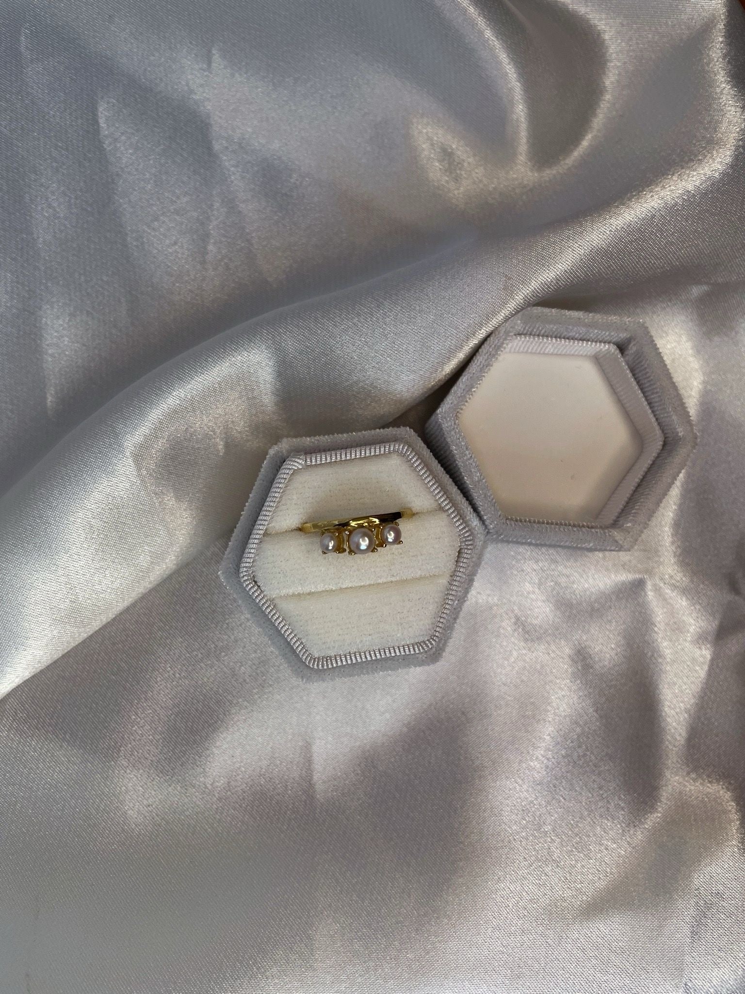 A beautiful ring made up of three natural pearls that illuminate a design in which, from its apparent simplicity , its true elegance and versatility are born.