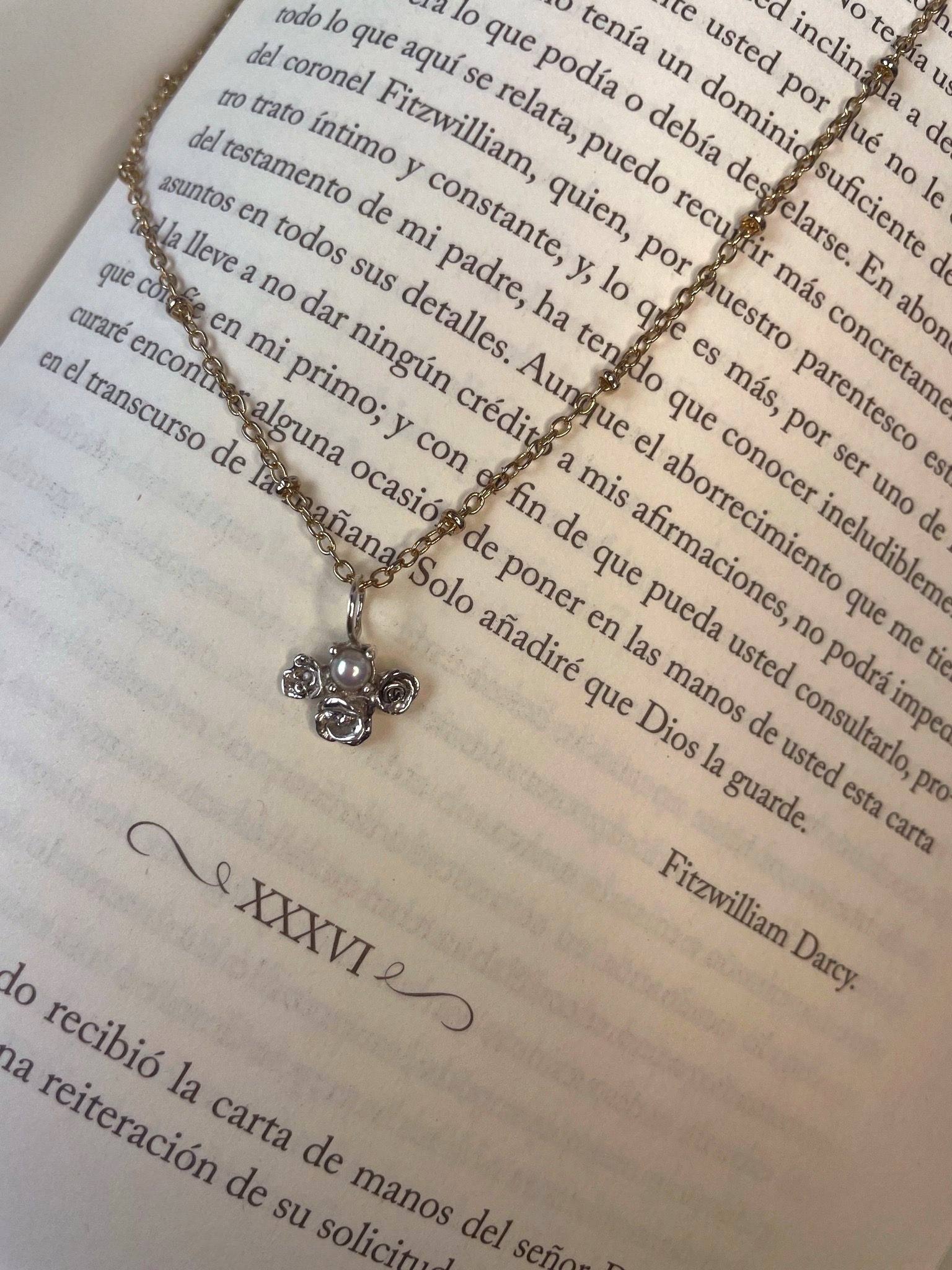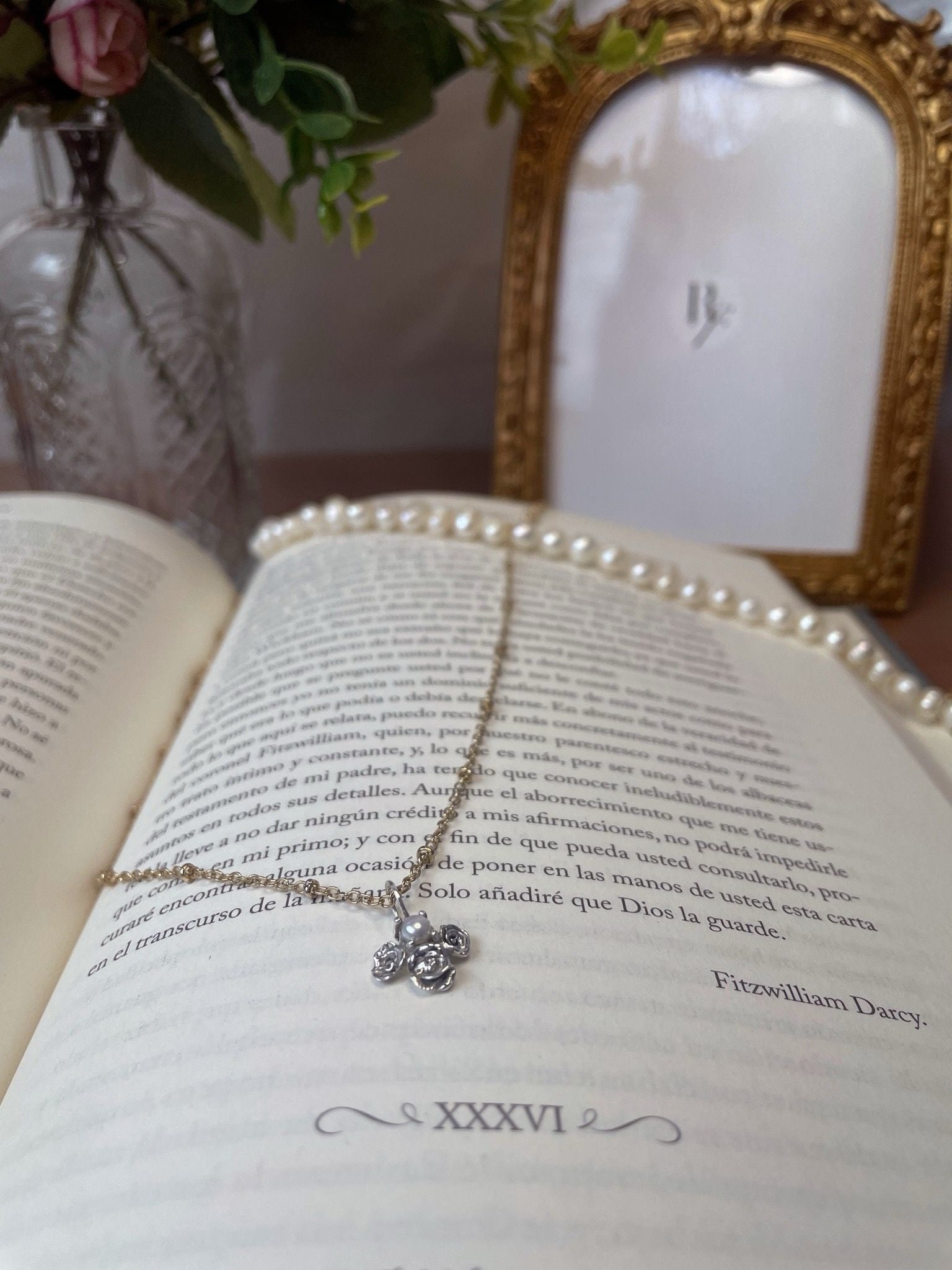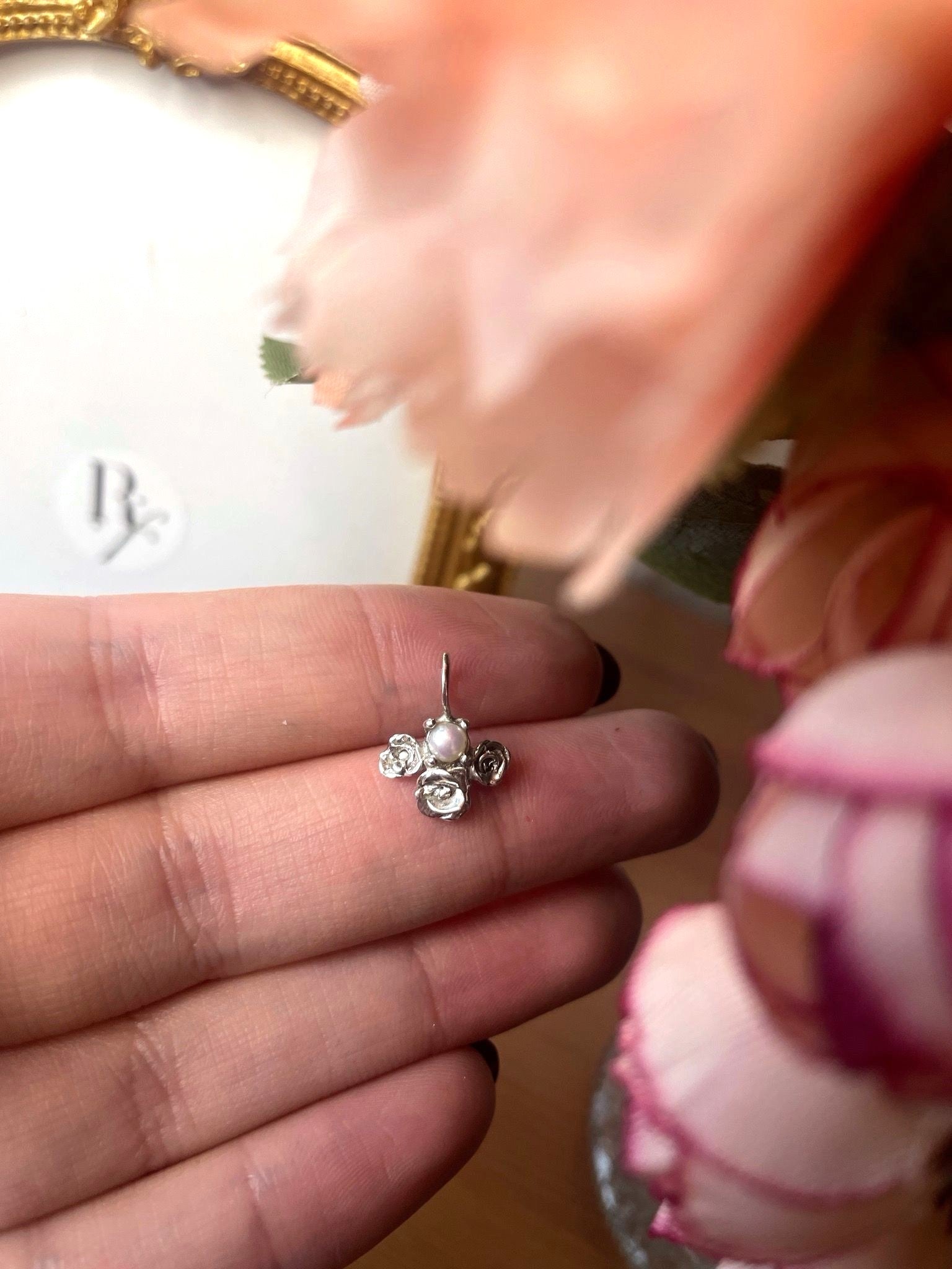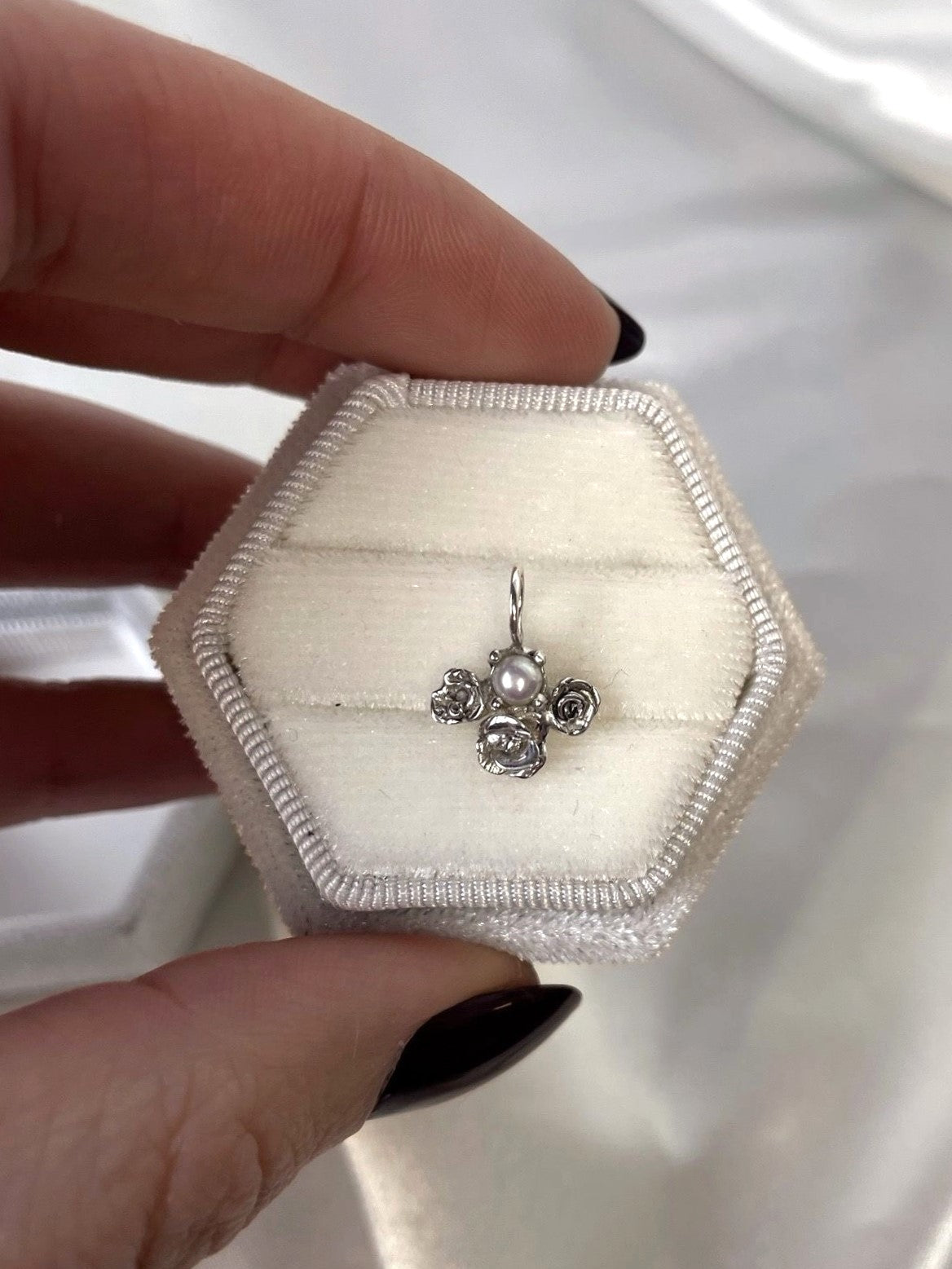 Tres elegantes flores ( pensamiento, rosa y camelia) realzan la luz propia de la perla central.