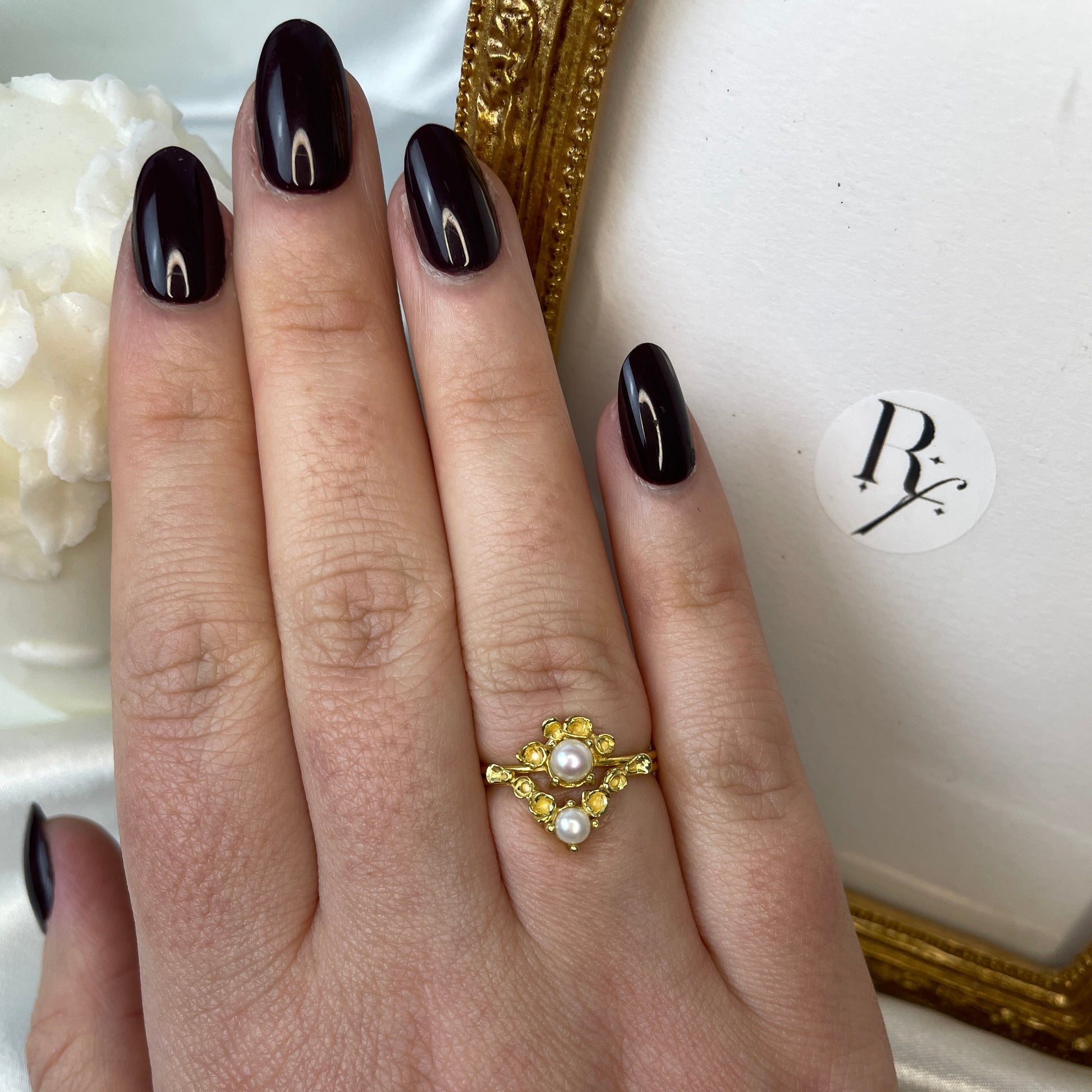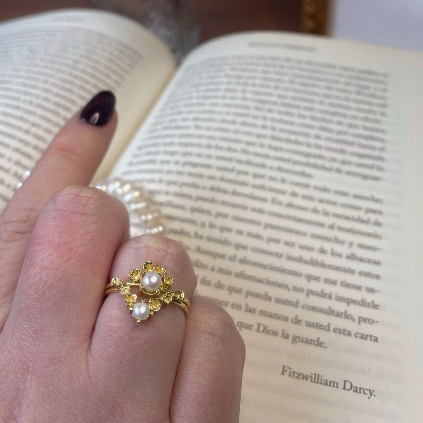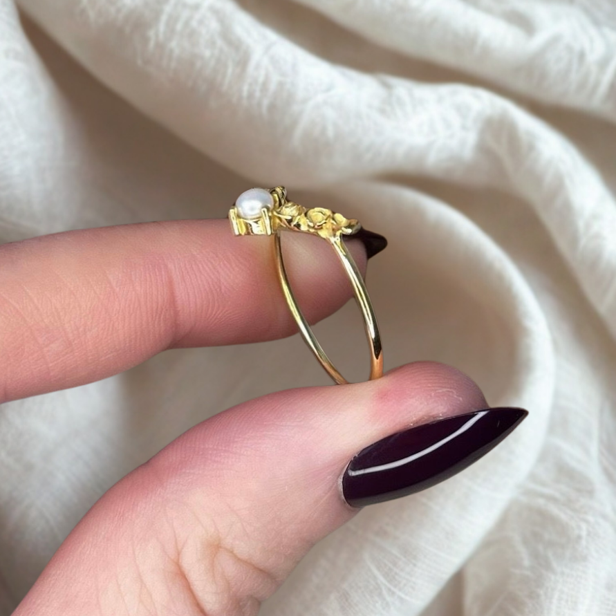 Un precioso anillo, en el que una delicada enredadera de flores abrazar una perla central, creando una armoniosa forma en “V” . La característica forma de esta pieza, hace que sea muy combinable con otros anillos de piedra central. Naturaleza convertida en arte.