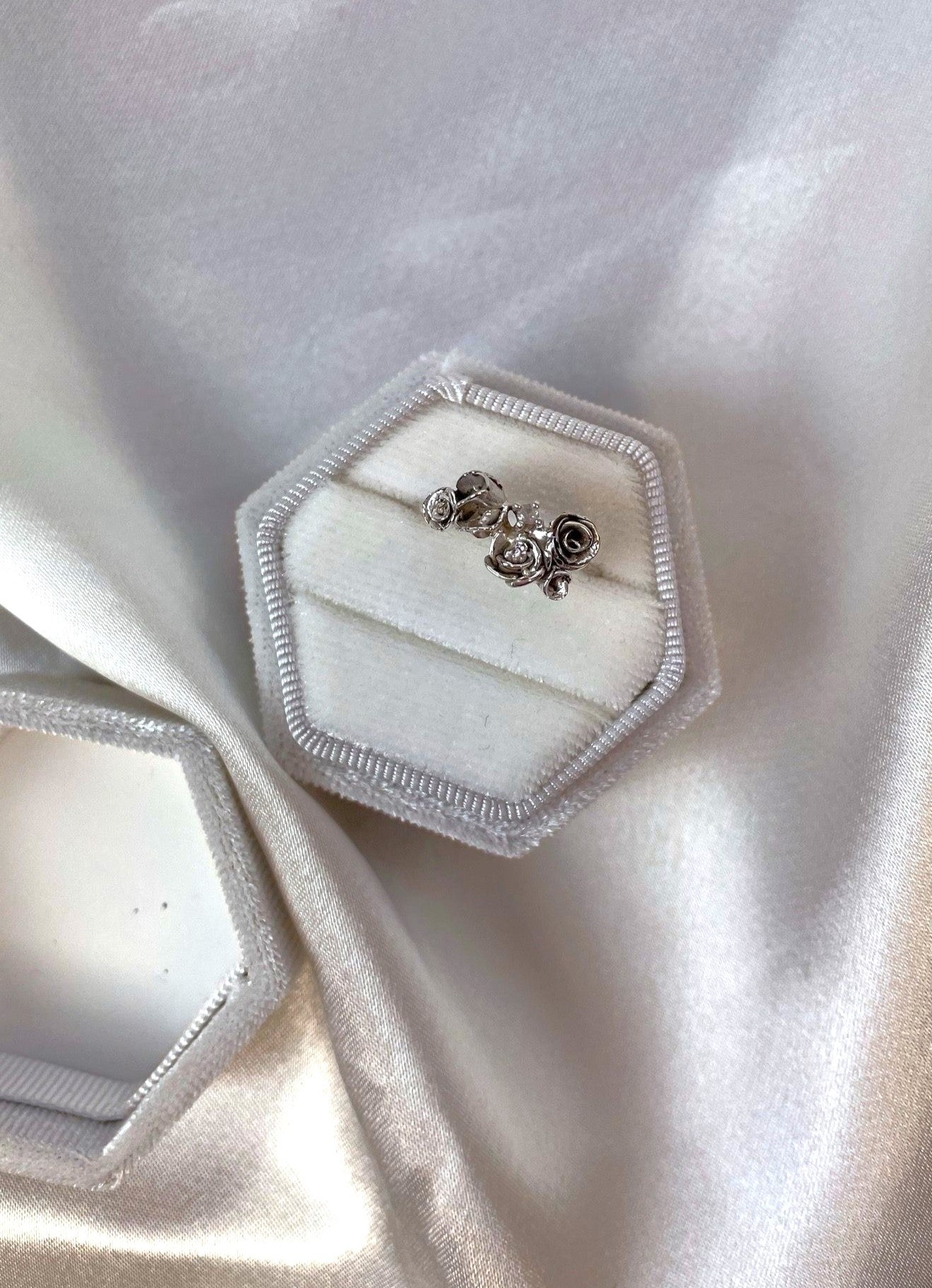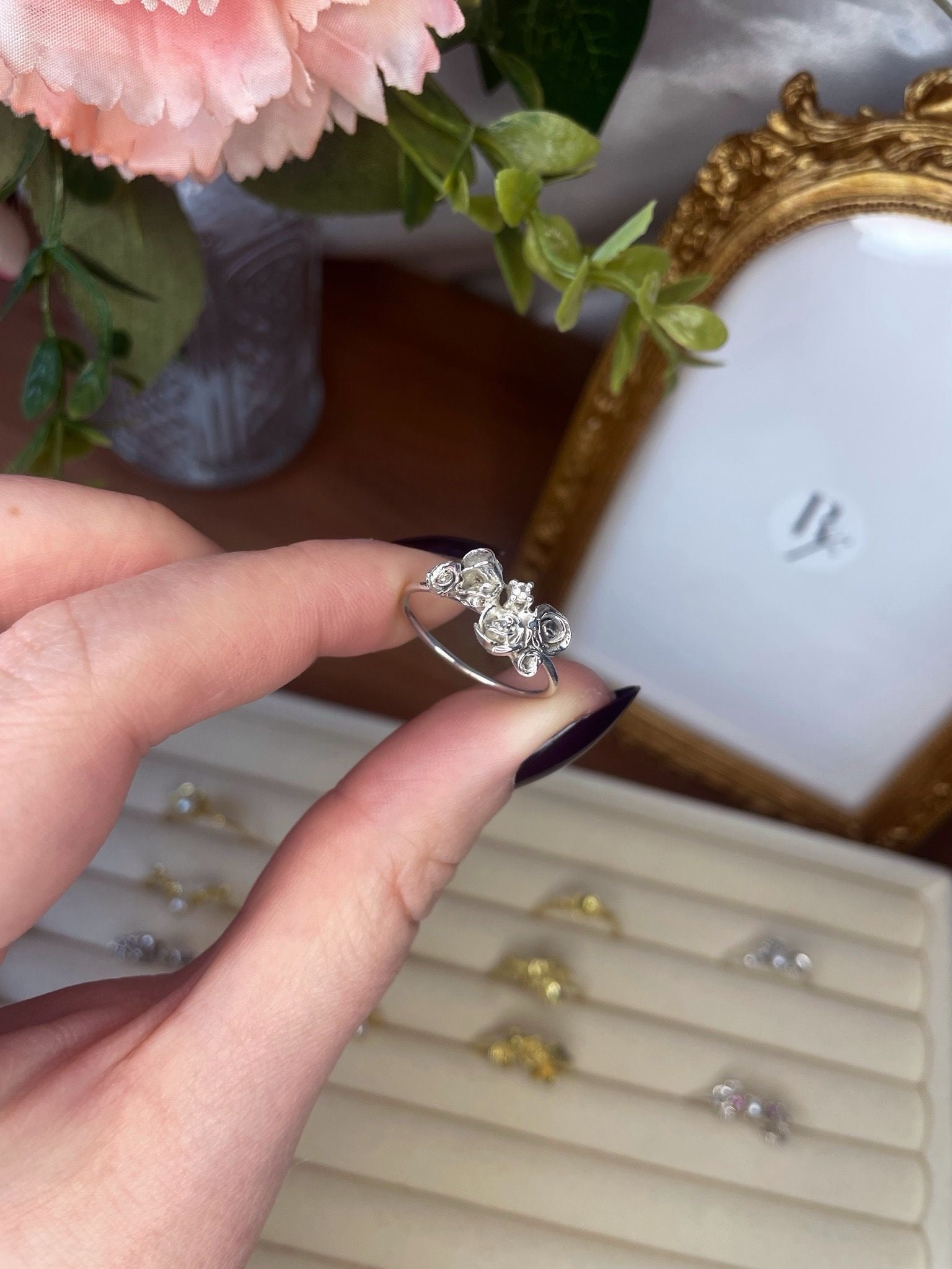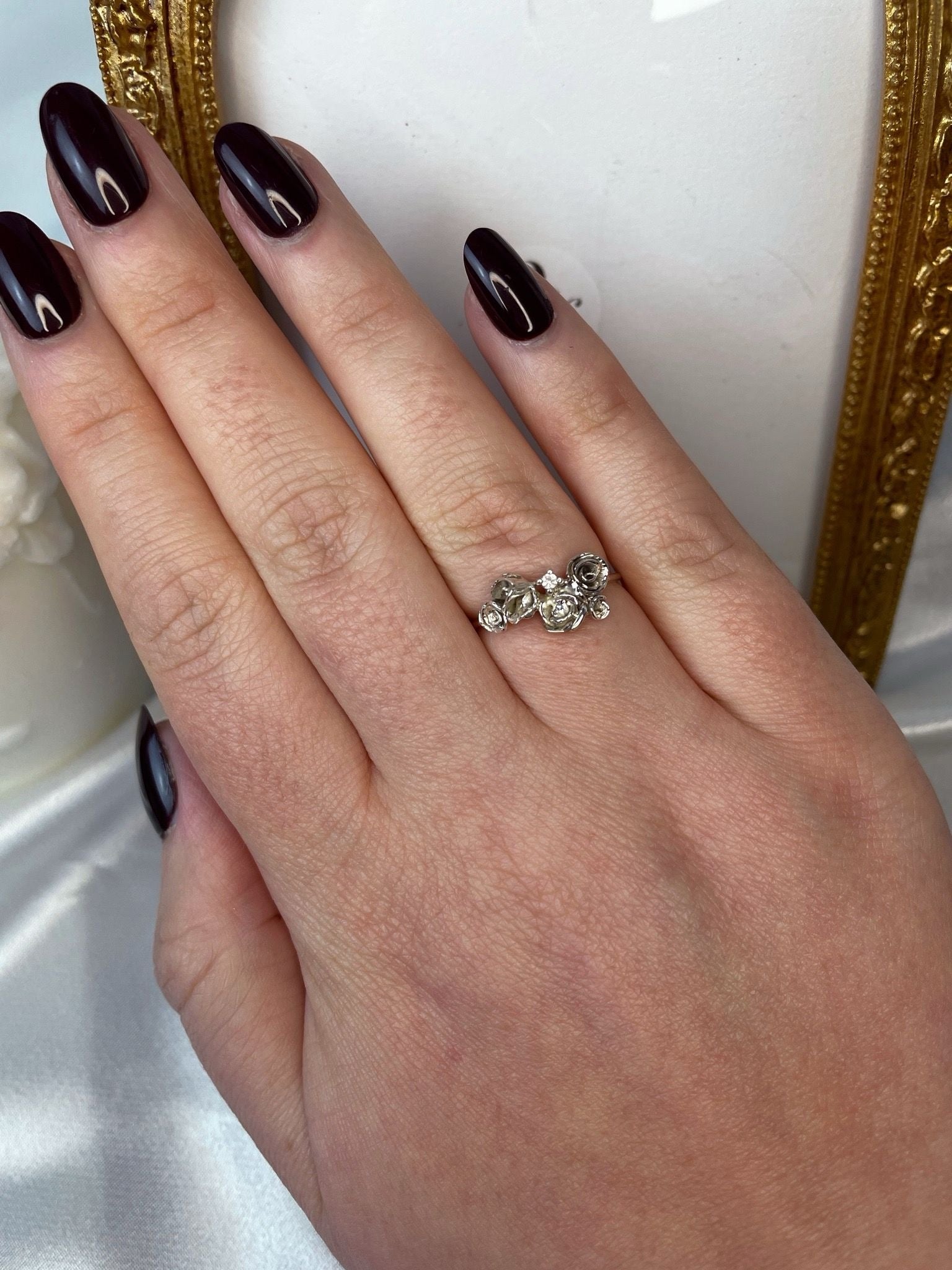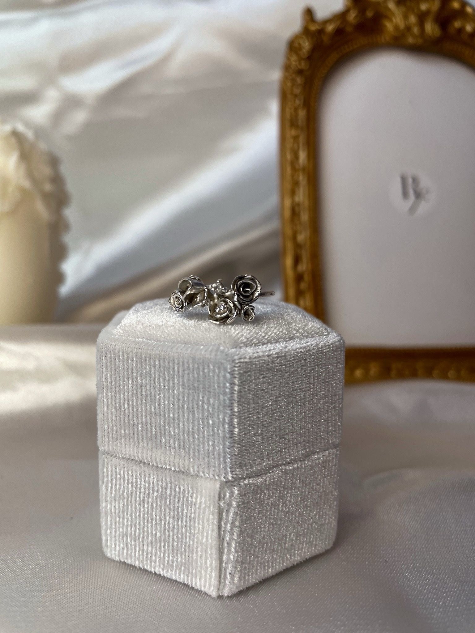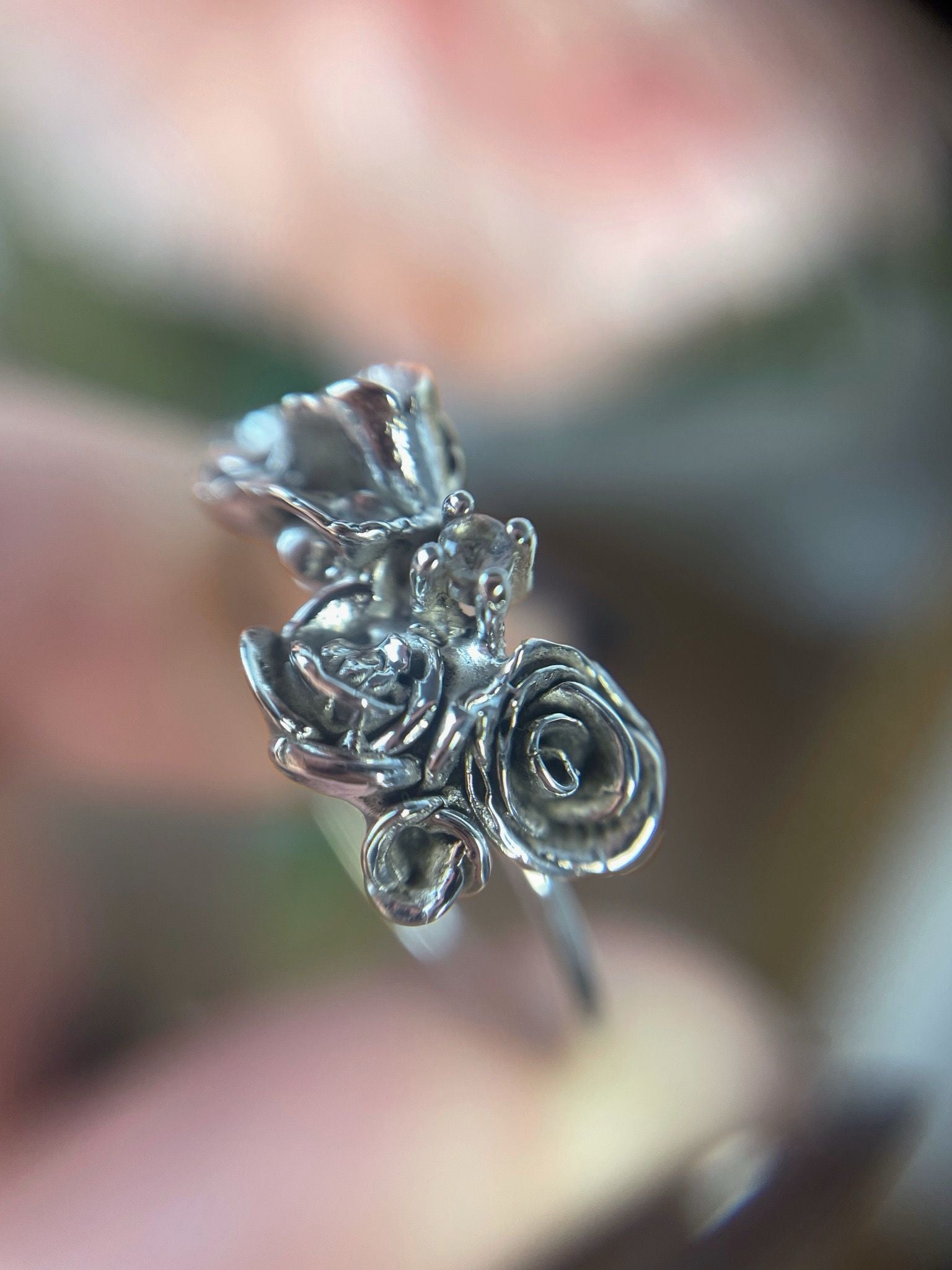 Un ramo de rosas sutil, elegante y eterno. Las rosas son las flores más cargadas de simbología, y así queda recogida en este anillo. La piedra preciosa, aporta un toque de brillo, elevando el diseño, y creando una joya realmente especial.